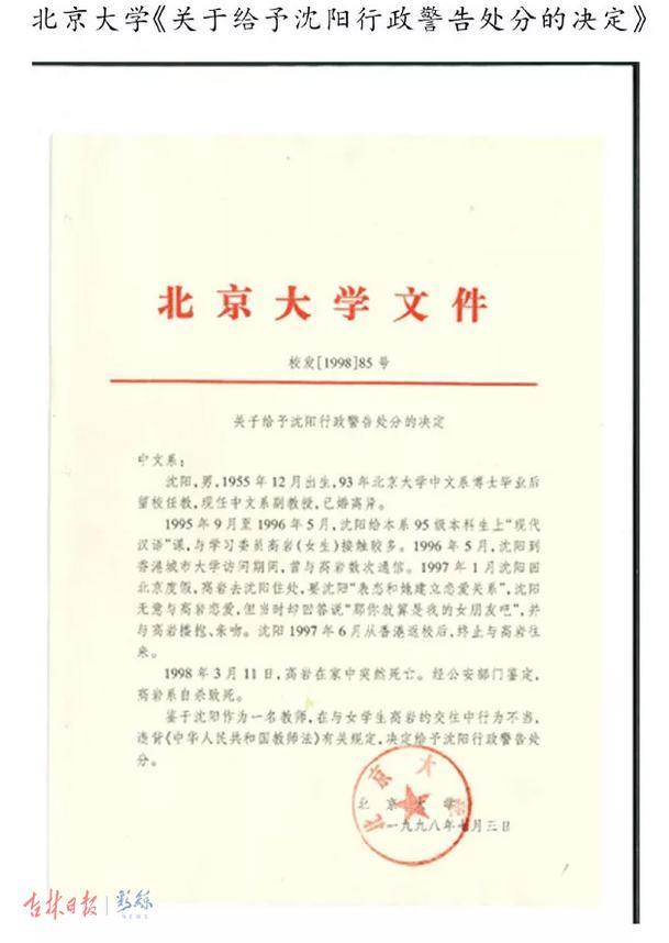 经查阅资料,二十年前,即1998年3月,北京市公安局西城区分局对这一件事作出事实认定,给出调查结果;1998年7月北京大学对沈阳做出了行政处分。