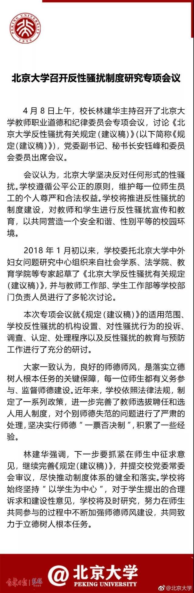 北京大学官方微博8日发布最新回应称,学校高度重视,教师职业道德与纪律委员会按照要求进行复核工作,调取了当年的档案材料,向当事和参与处理此事的中文系与校纪委领导进行了了解。