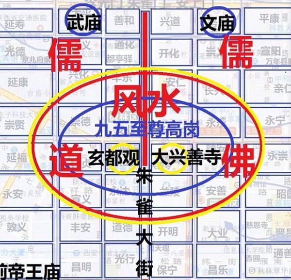 宇文恺为了镇住“九五至尊”之位的龙气,安排佛祖和三清天尊全“住”在这里。在“九五高岗”之上,长安城中轴线-天街(朱雀大街)街东建大兴善寺,在街西建玄都观,一佛一道镇住了这里嗖嗖往外涌出的龙气。