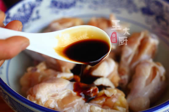 2、在盛着鸡翅根的碗中,放入适当的老抽。