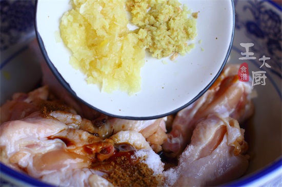 8、再将准备好的蒜泥和姜末一同放在鸡翅根中。