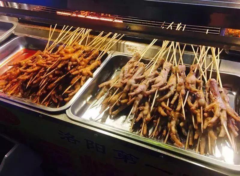 街道被灯笼晕染成橙黄色,两边档口林立,全部是卖小吃的摊子。烤翅、炒海鲜、烤鱼、小龙虾、洛阳牛肉汤,当地小吃和全国特色美食都可以在这里见到踪迹。