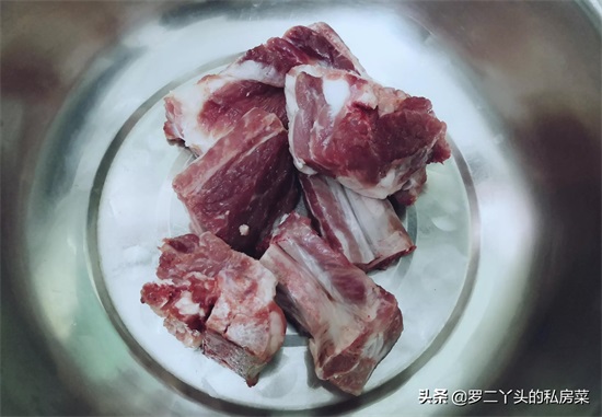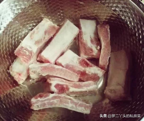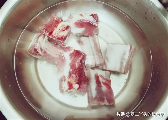 第一步,我们把买回来的排骨用40度左右的温水泡至半小时以上,清洗干净。冷水是洗不掉脏东西的,因为肉有油,冷水油不会化。泡的目的把血水泡出来,减少腥味。