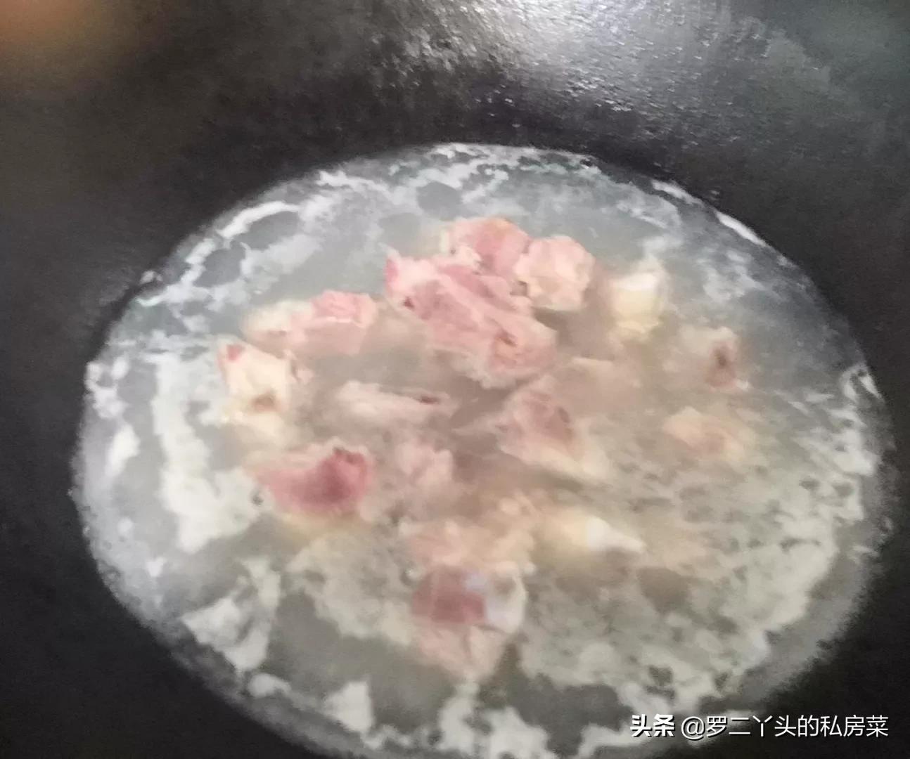 第二步,锅内加入半锅水,加入一些料酒,盐,生姜片,葱,把泡好的排骨放进去,这里是排骨冷水进锅,因为加热的过程中,排骨的血水也会跟着排出去。大火烧开撇去浮沫。焯水15分钟捞出用清水洗干净。