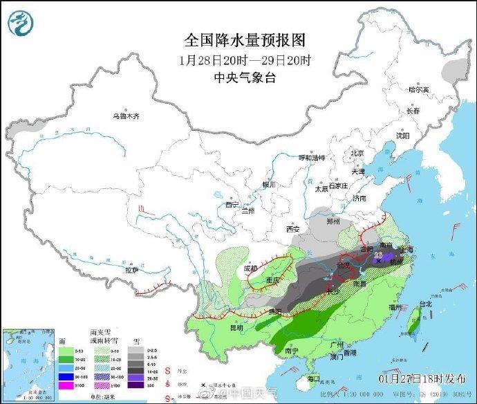 预计1月27日20时至28日20时......其中湖北东部和南部、湖南北部和安徽中南部等地的部分地区暴雪,积雪深度可达4~8厘米,局地恐达15厘米以上。