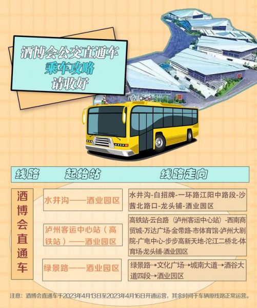 ●首末班时间为6:00-19:00,发班间隔10-15分钟。线路具体走向为绿景路发车经市政府、长江大桥、绕城路、金沙路、酒谷大道、泰安至酒业园区。城区中心半岛大山坪和城南片区市民可在线路途经公交站点乘坐此线路公交车直达酒业园区。