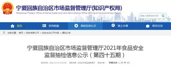 中国质量新闻网讯 12月15日,宁夏回族自治区市场监管厅网站公示2021年食品安全监督抽检信息(第四十五期)。本次抽检酒类样品38批次,37批次合格,1批次不合格。