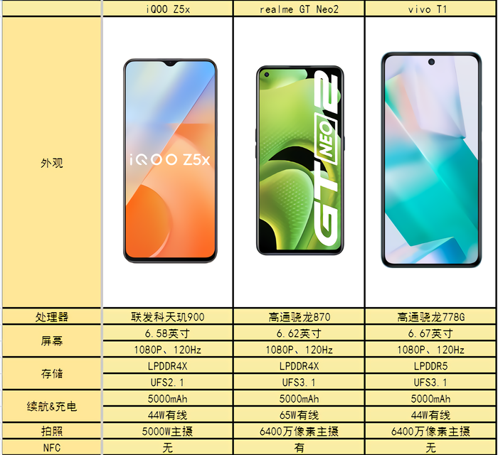 为了解决这个问题,厂商们除了努力在手机里塞入大容量电池以外,通常还会配备高速快充来提升低电量时的回血速度。所以,今天就为大家带来了几款5G快充神机,它们分别是iQOO Z5x、真我GT Neo2、vivo T1,首先来看主要参数表。