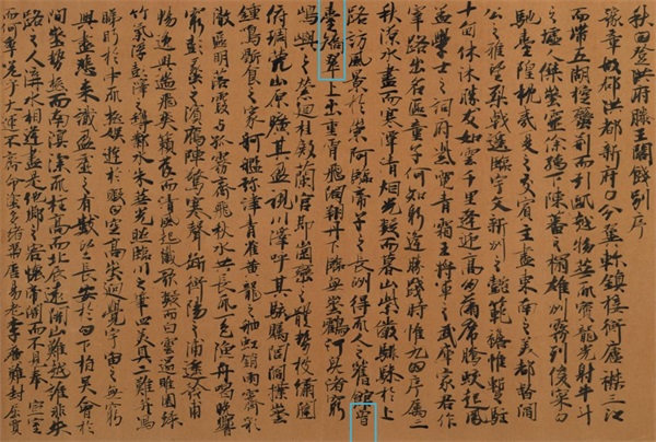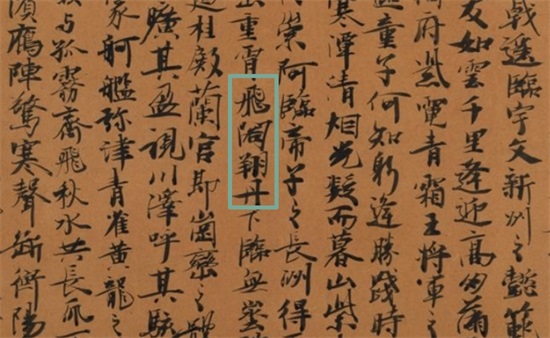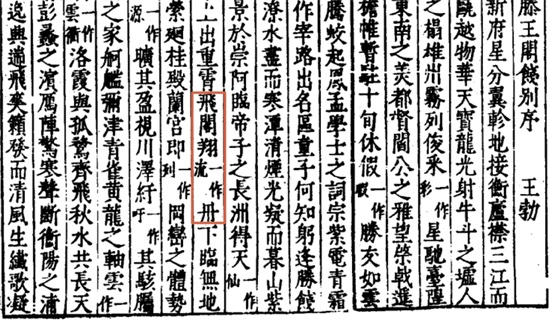 “层台耸翠”的时候,我引用了《文苑英华》收录版和日本正仓院的抄本。在这里为什么不提呢?我的原则是,在真迹已经失传和没有确定为精准抄本的情况下,所有记载,有分歧的部分,只能参考。《文苑英华》是目前最权威的版本之一,可信度极高,但不等于没有“错误”。比如这句记载了“飞阁翔(一作 流)丹”),二者兼收,偏于“翔”,可见也不能确定就是“翔”。而其他很多字词的不同版本,直接就能辨别而不予收录。日本正仓院唐抄本是“飞阁翔丹”。