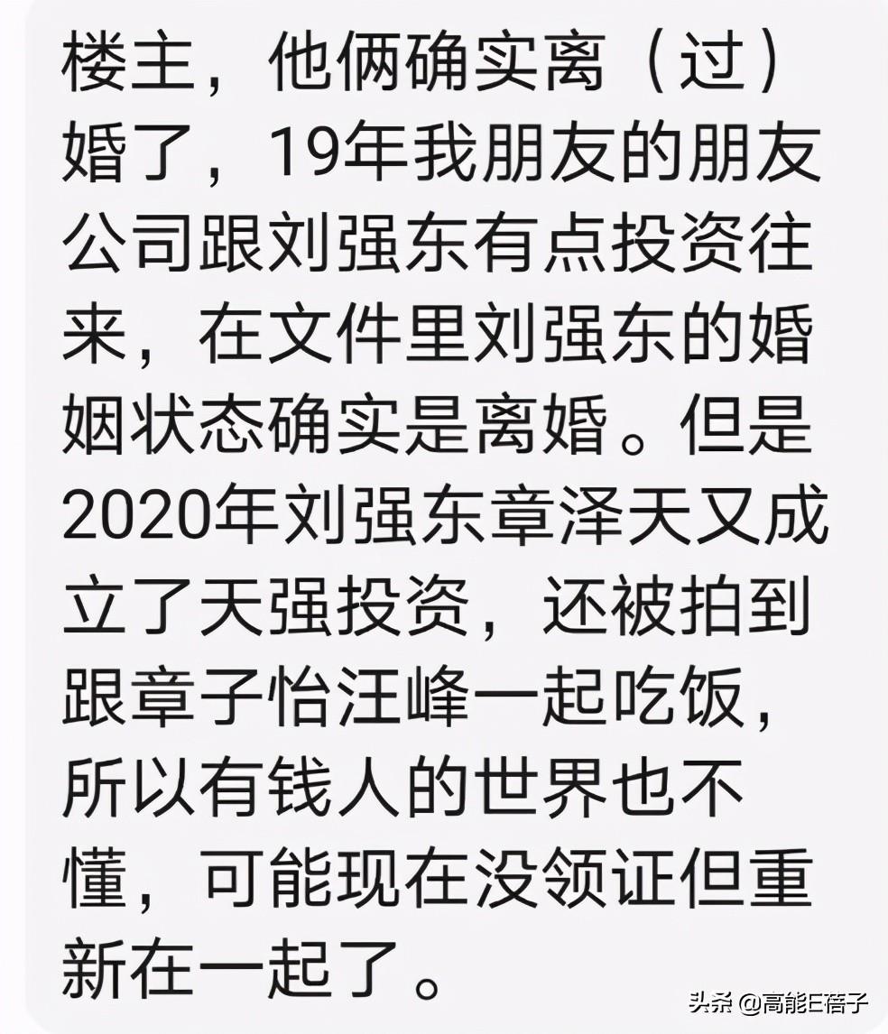 而最近,又再次有网友出来爆料称2019年曾与刘强东有投资往来,在文件里看到刘强东的婚姻状态是离婚,但是2020年夫妻二人又成立了新公司,还被拍到与汪峰章子怡一起吃饭,似乎又再次复合。