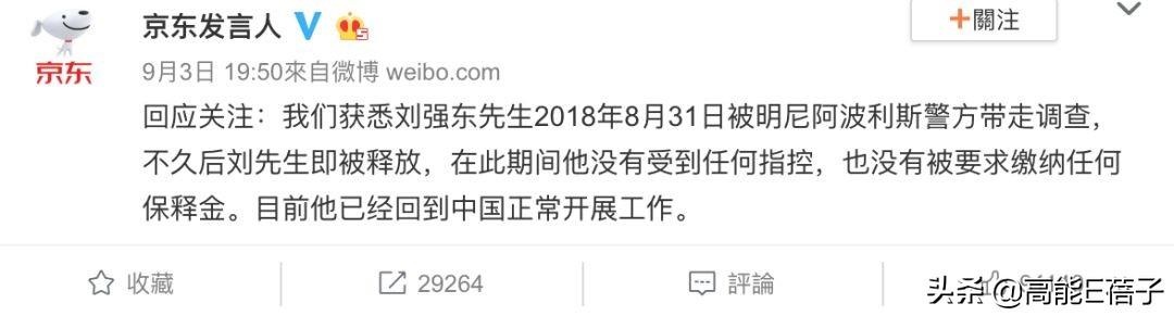 9月3日,京东再次回应,证实刘强东曾被带走调查,但不久被释放了。