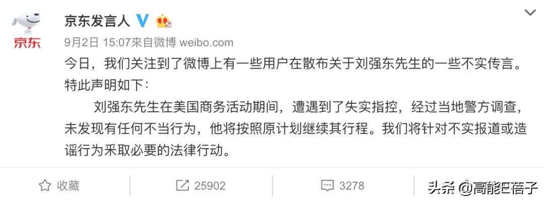 2018年9月,网友发帖称:九月初,刘强东在美国涉嫌X侵被抓。很快,这个消息扩散到微博,京东则回应称是微博用户的不实传言,发了一个小声明。