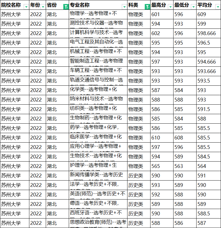 苏州大学在湖北2022年文理招生专业录取分数线: