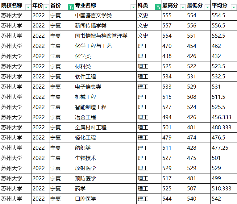 苏州大学在宁夏2022年文理招生专业录取分数线: