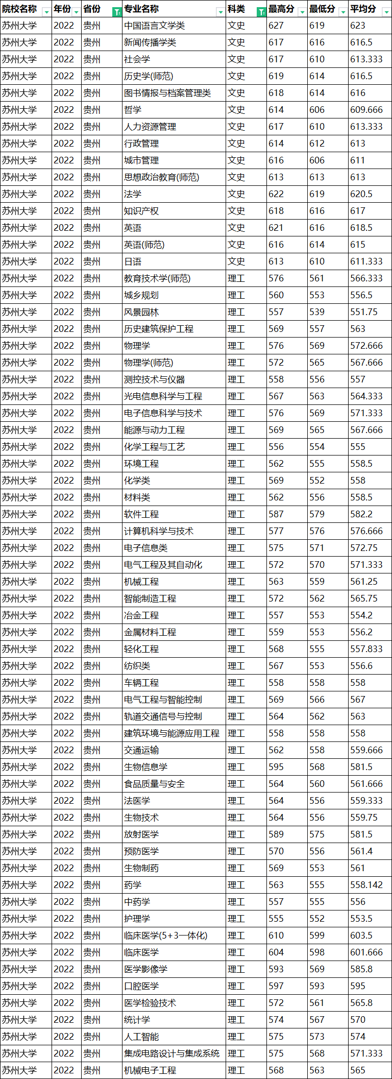 苏州大学在贵州2022年文理招生专业录取分数线: