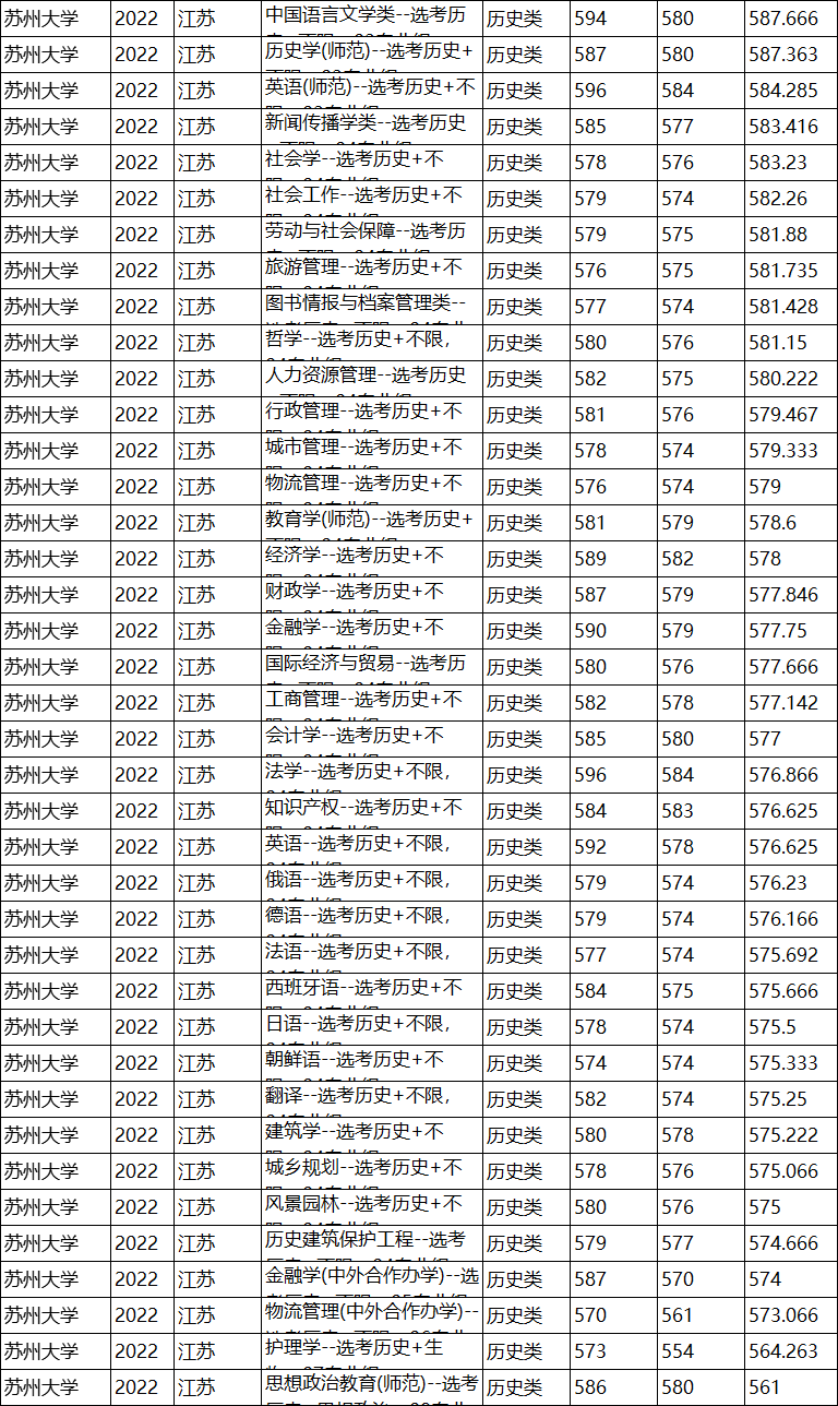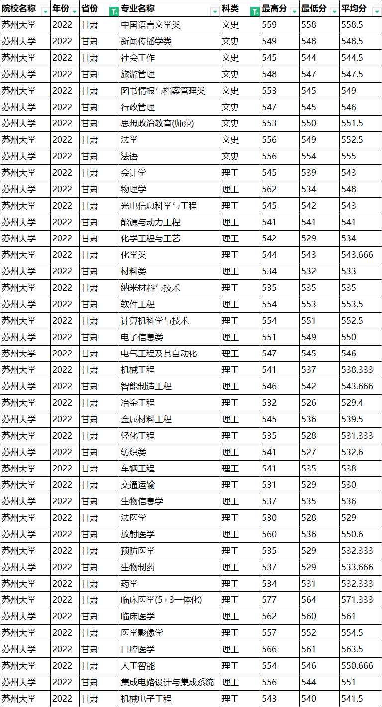 苏州大学在甘肃2022年文理招生专业录取分数线: