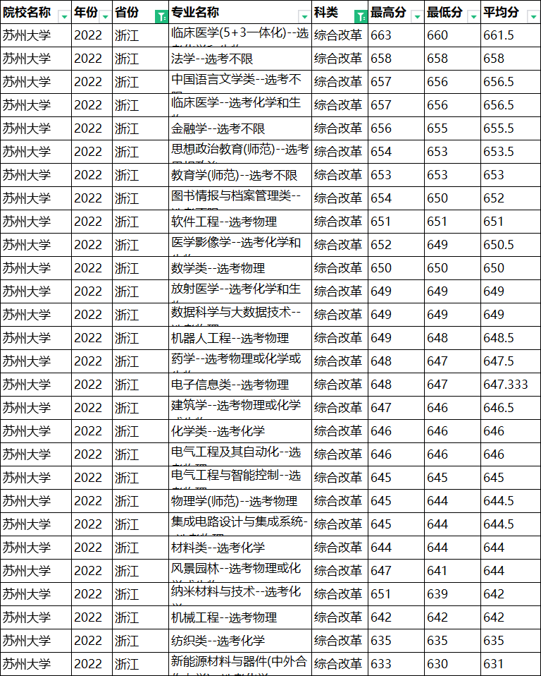 苏州大学在浙江2022年文理招生专业录取分数线: