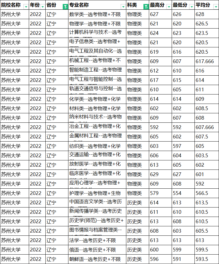 苏州大学在辽宁2022年文理招生专业录取分数线: