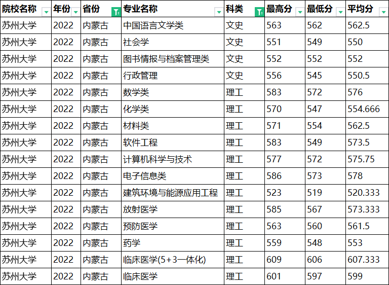 苏州大学在内蒙古2022年文理招生专业录取分数线: