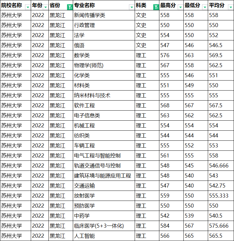 苏州大学在黑龙江2022年文理招生专业录取分数线: