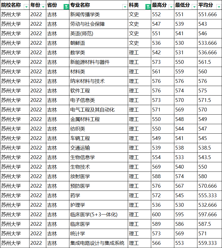 苏州大学在吉林2022年文理招生专业录取分数线: