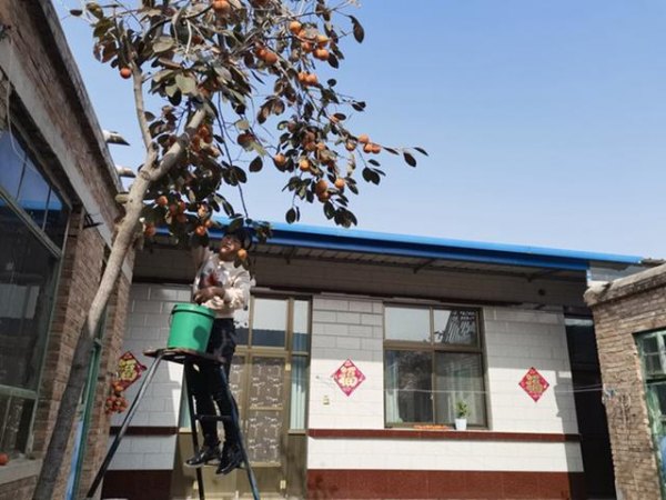 10月24日,邱瑞东的妻子邱志芬在自家小院采摘成熟的柿子。新华社记者 杜一方 摄