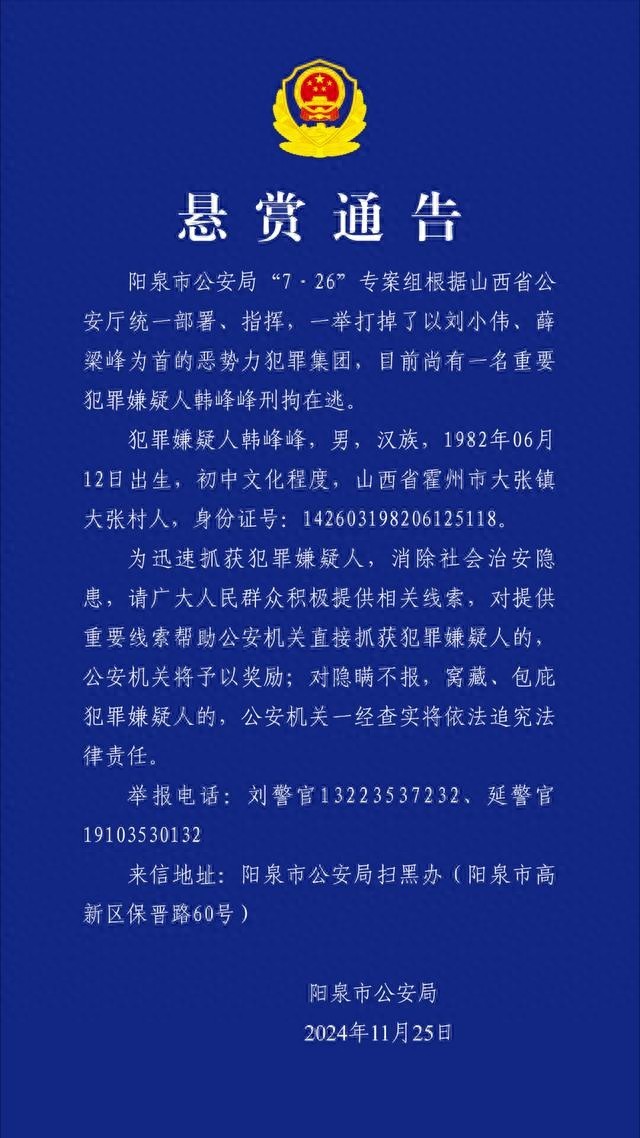 11月25日,山西阳泉市公安局发布悬赏通告:
