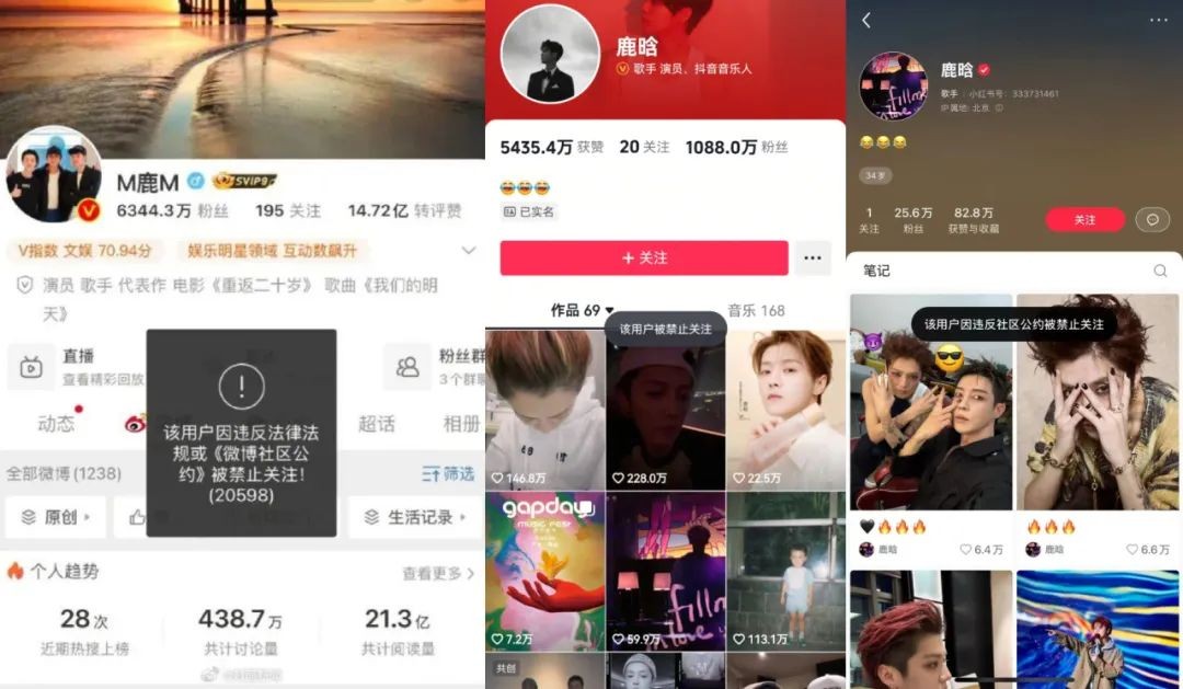 澎湃新闻注意到鹿晗在微博、抖音、小红书三大平台的账号被禁止关注。有平台显示“该用户因违反社区公约被禁止关注”。