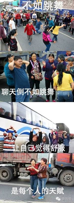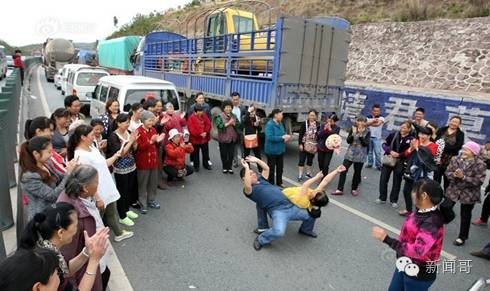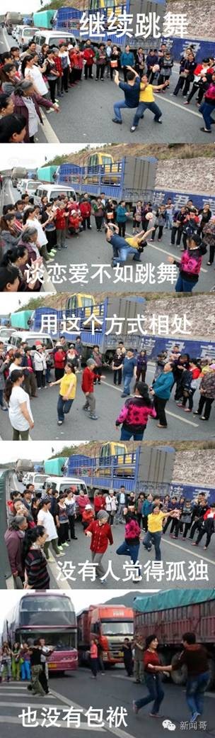 事情是这样的:去年 4月22日,云南一段高速公路发生交通事故,造成堵车。被堵路上的大爷大妈纷纷下车解闷,其中不少大妈竟然在车缝中跳起了广场舞。