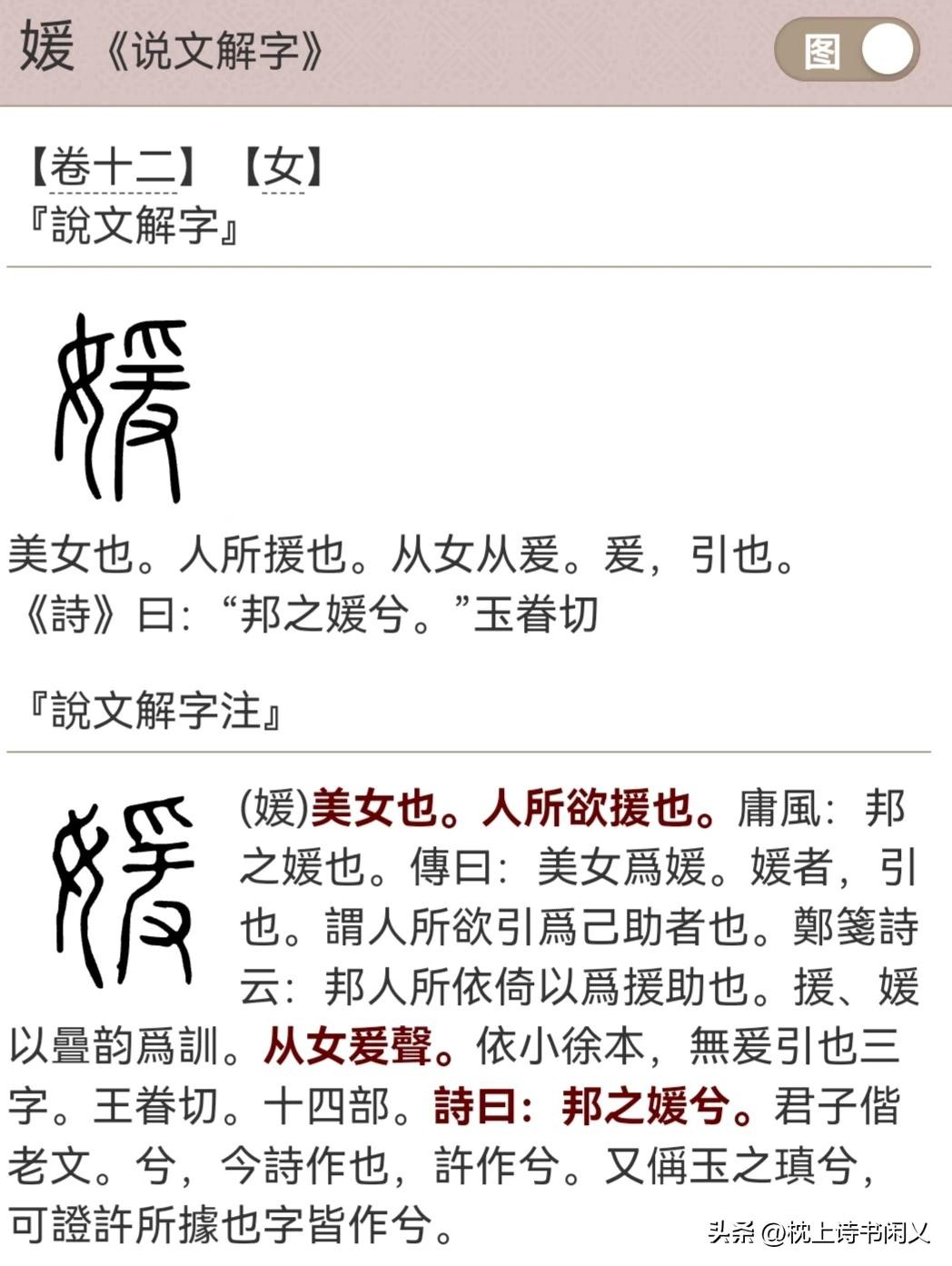 媛,美女也,人所援也。从女,从爰,爰,于也。 —— 《说文》