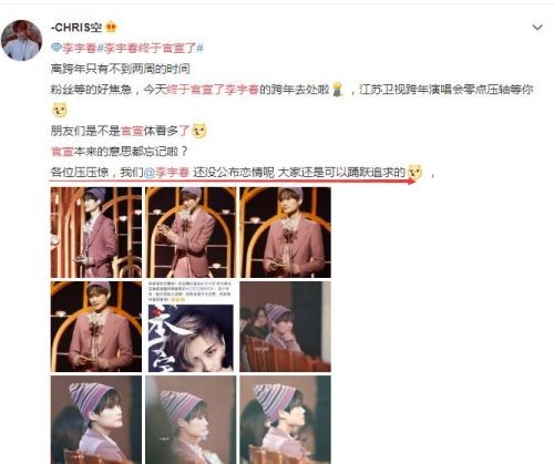 李宇春终于官宣了是怎么回事,李宇春官宣了什么呢?2018年差不多只剩下最后的10天,目前,各大卫视跨年晚会都在抢夺各路明星加盟自家春晚。而对粉丝们来讲,自己爱豆去参加哪个卫视的跨年卫视自然是很重要的。李宇春之前一直未传出消息,今天(12月19日)中午终于官宣,继续加盟江苏卫视今年的跨年晚会,网友们纷纷表示等了好久终于定了。让我们来看一看具体怎么回事吧