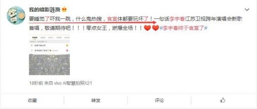 今日,李宇春 加盟2019江苏卫视跨年演唱会正式官宣。连续十数年零点压轴的李宇春成为了跨年演唱会的标识性嘉宾。此次,春春依旧在零点献上全新单曲的首唱舞台 。据悉,这已经是李宇春连续3年在江苏卫视跨年演唱会亚洲演出了,真是很棒的爱豆呢。不过对于这个官宣体,网友有话要说: