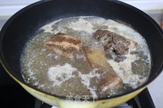 5.将腌好的肉块入凉水锅中煮开,上面有些腌肉料的末末也不要紧,带着它更入味,实在看不顺眼也可以用刀刮净再入锅中煮;