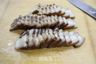 9.凉到温热的肉块切片,刀功好就切成2、3毫米厚的片,刀功差些就切得厚一点,尽量均匀;