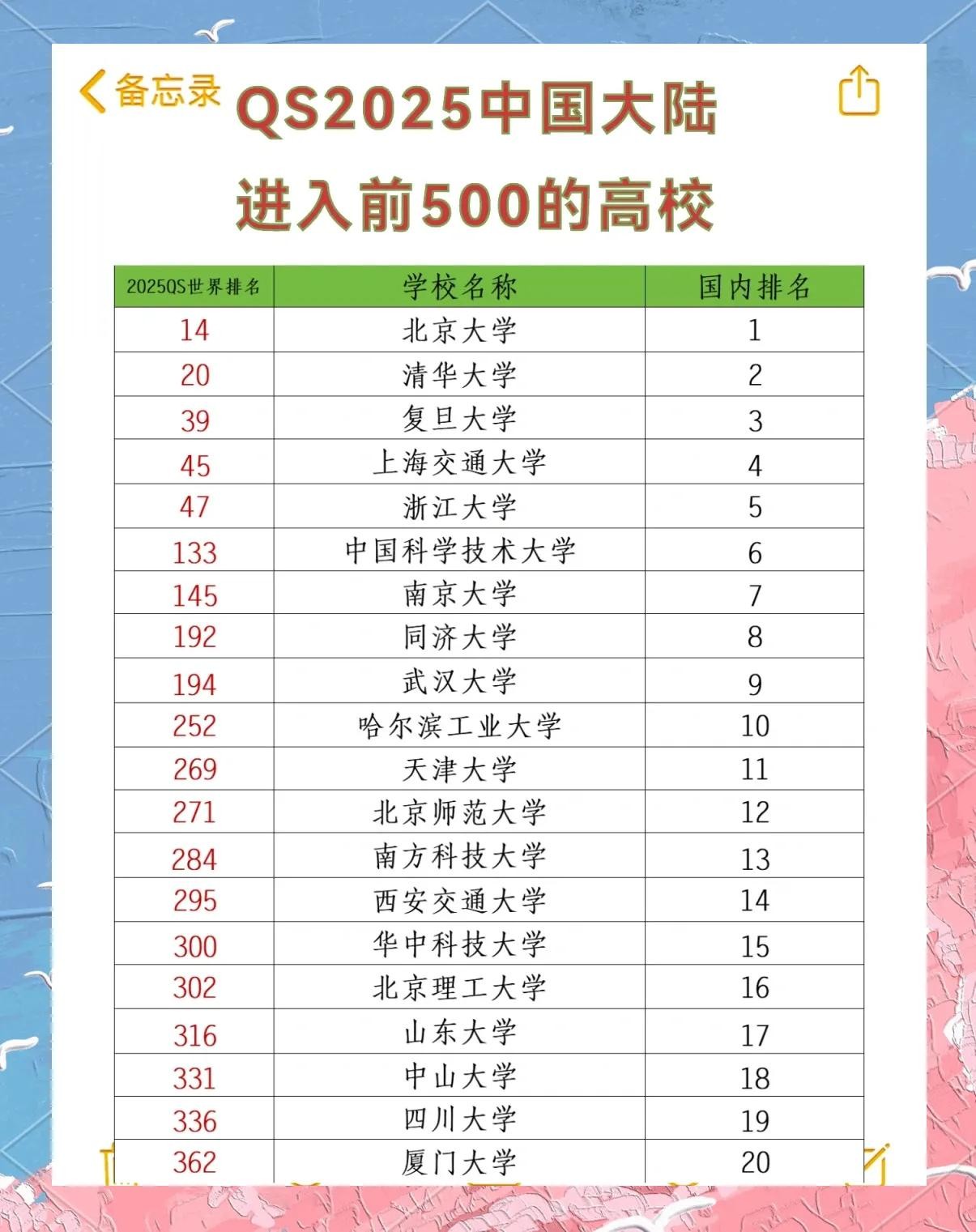 QS 2025世界排名中,复旦第一(全球39)与上交第二(全球45)、浙大第三(全球47)跻身全球前50,而中科大第四(全球133)和南大第五(全球145)则受限于国际化指标。