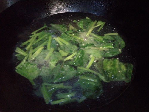 ④锅中倒入植物油,油温加热到6成热,放入葱花来爆香,然后放入菠菜开始煸炒,保持大火不停的去翻拌一下,大概15秒钟就可以了。
