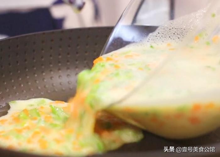 第四步:锅中加入适量的油,五成油温倒入准备好的苦瓜丁蛋液,全程中小火煎制,直至形成正反两面的蛋面呈现出微微泛焦的状态,就可以出锅,切成小块上桌品尝了。