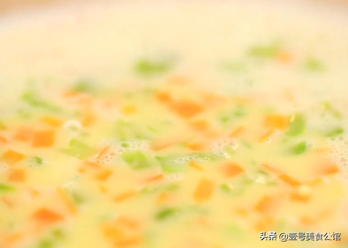 第三步:把煮熟的苦瓜丁和胡萝卜丁倒入装有鸡蛋液的碗中,顺时针搅拌30秒备用。