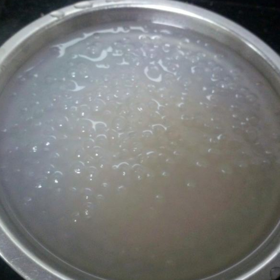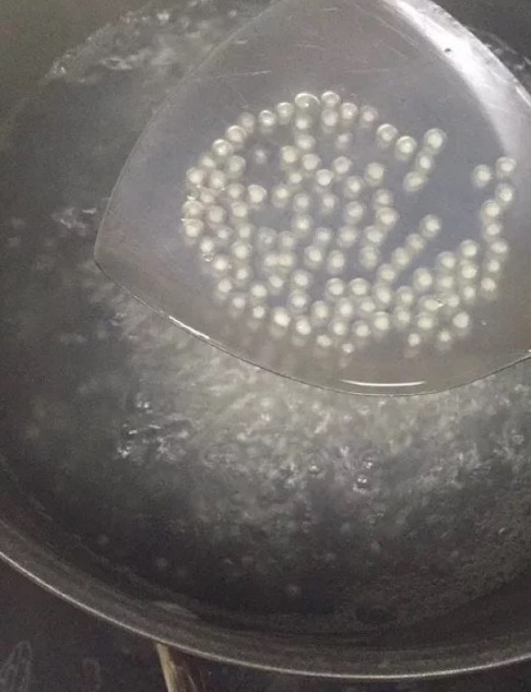 第三步,这时候将锅清洗干净,再倒入适量的清水,用大火烧沸后,把焖好的西米倒入锅中,再次煮沸。(小知识点,之所以将煮完西米的锅清洗干净,是因为第一次煮完的西米捞出以后,锅中会剩余大量的淀粉,如果不清洗,再接着煮西米就会糊锅)