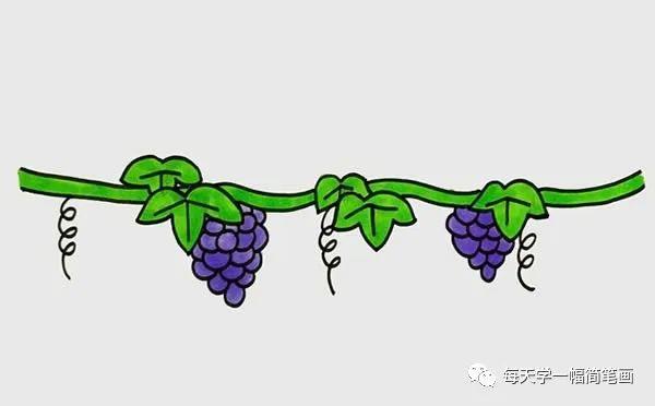 先画出两片叶子,往右继续画叶子,注意越往右叶子越小,接着画出葡萄藤,然后在叶子下面画出一大串的葡萄,最后给叶子涂上绿色,葡萄涂上紫色,一棵葡萄树就画完了。