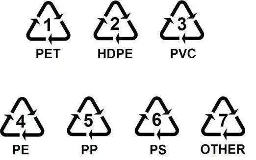 目前在国际上通用、我国也开始使用的塑料回收标志是一个三角形符号,一般在塑料容器底部。三角形里边有1~7的数字,每一个数字表示该制品是用何种树脂材料制成的。