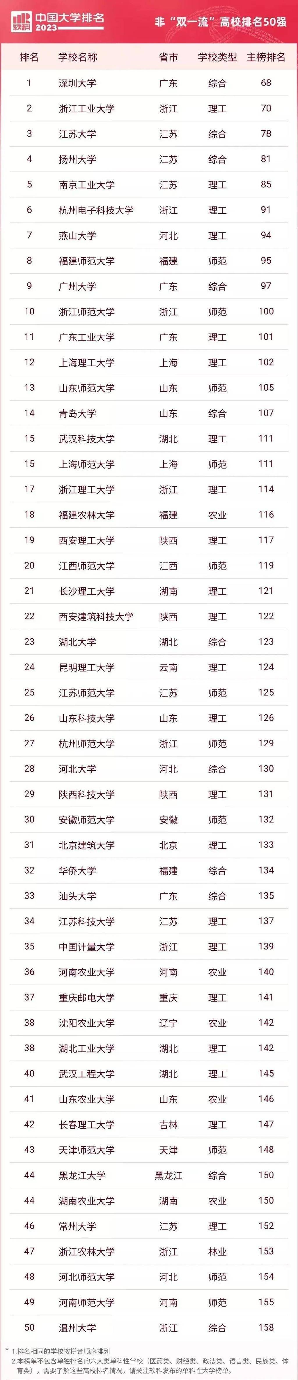 此外,还有很多“双非”院校实力也超强。我们来看看2023年软科中国大学排名中的前50所“双非”高校: