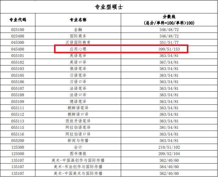 大部分专业复试线即国家线,但也有个别专业竞争激烈,复试线极高。例如应用心理,复试线高达399,拟录取考生初试成绩清一色的400+。