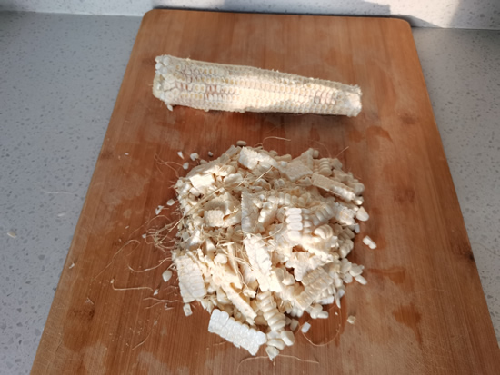 1、先把新鲜玉米用刀把玉米粒切下来,再把玉米粒切碎一些,这样烧出来的汤喝着更香浓。