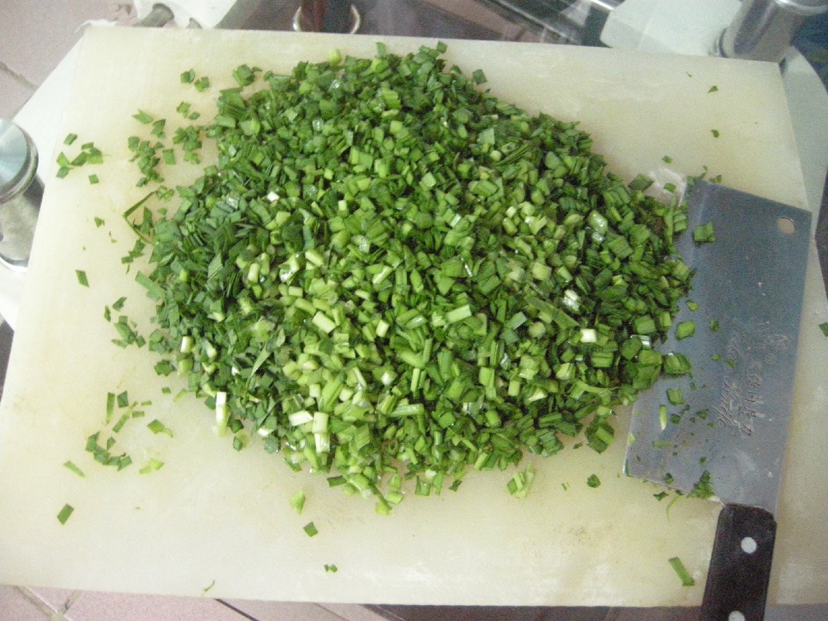 4、韭菜摘洗干净,控干水分。切去老根部分不要,再切成0.5厘米的小段。