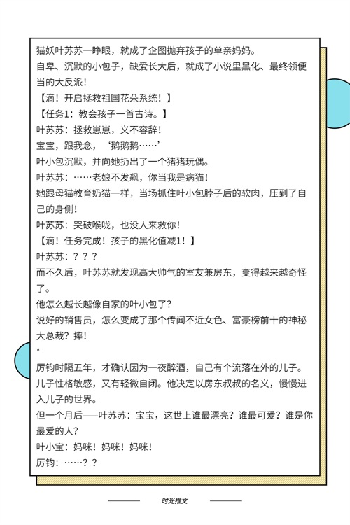 第四本:女主原本是猫妖,然后穿到现代得到了一个“养娃系统”,为了防止孩子黑化,女主只得战战兢兢地做系统发布的任务。