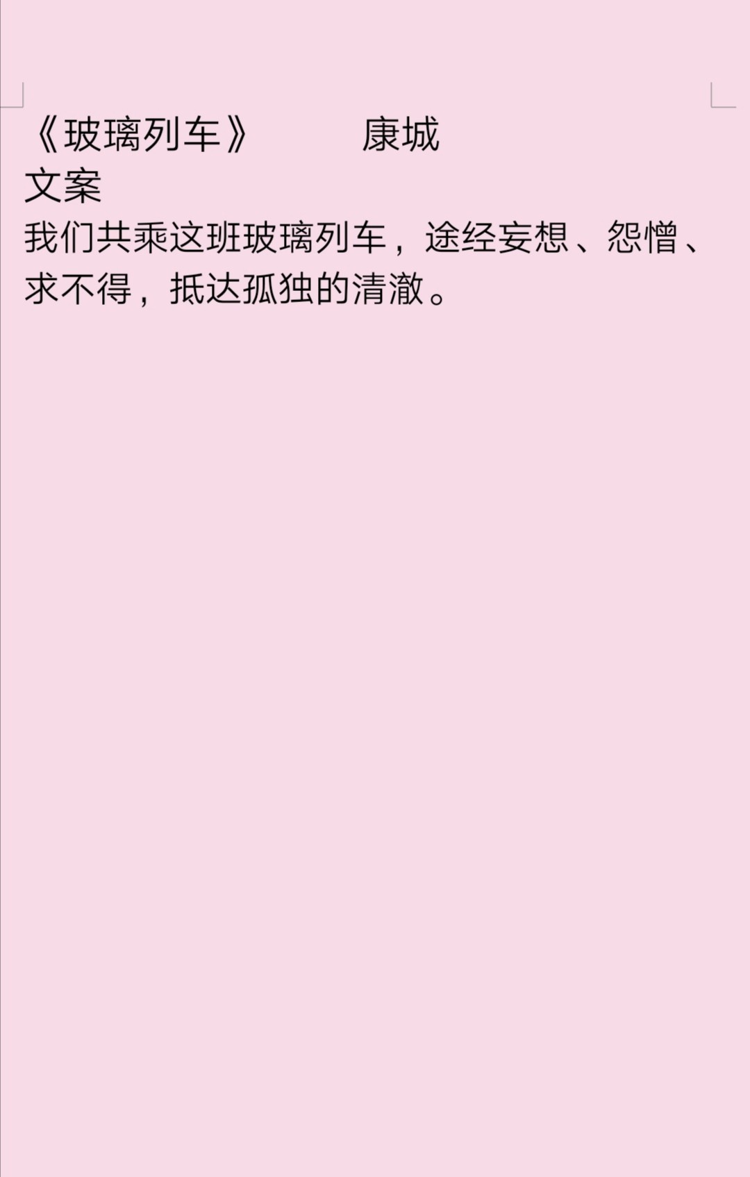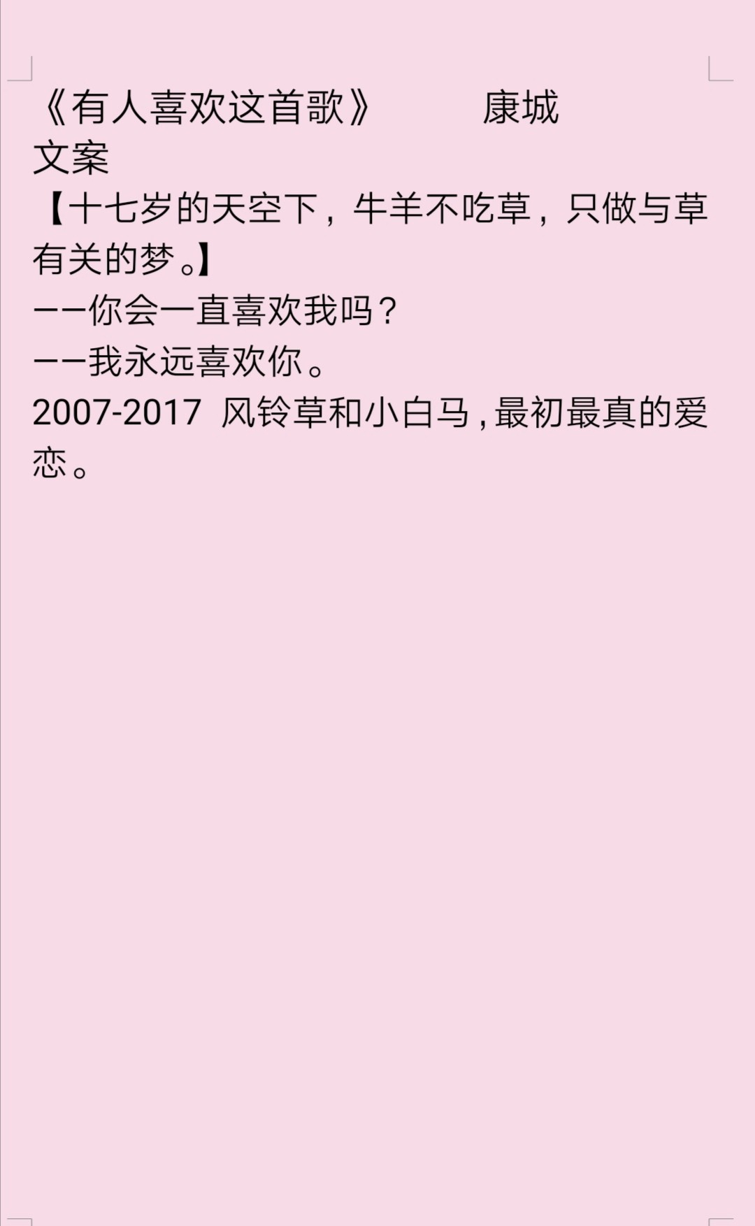 哈喽,今天要给大家带来的作者是康城啦,康城的作品,真的都蛮好看,而且偏现实向,而且大大的文笔真的没的说,描写得很细腻,细节描写抓得很到位,康城为什么总能把故事写得什么直戳人心呢!!《玻璃列车》、《在骤雨停歇之前》《有人喜欢这首歌》《悬旗》这几本都非常好看,真滴!强烈安利!好了,我们直接上文叭!《有人喜欢这首歌》~~~~~~