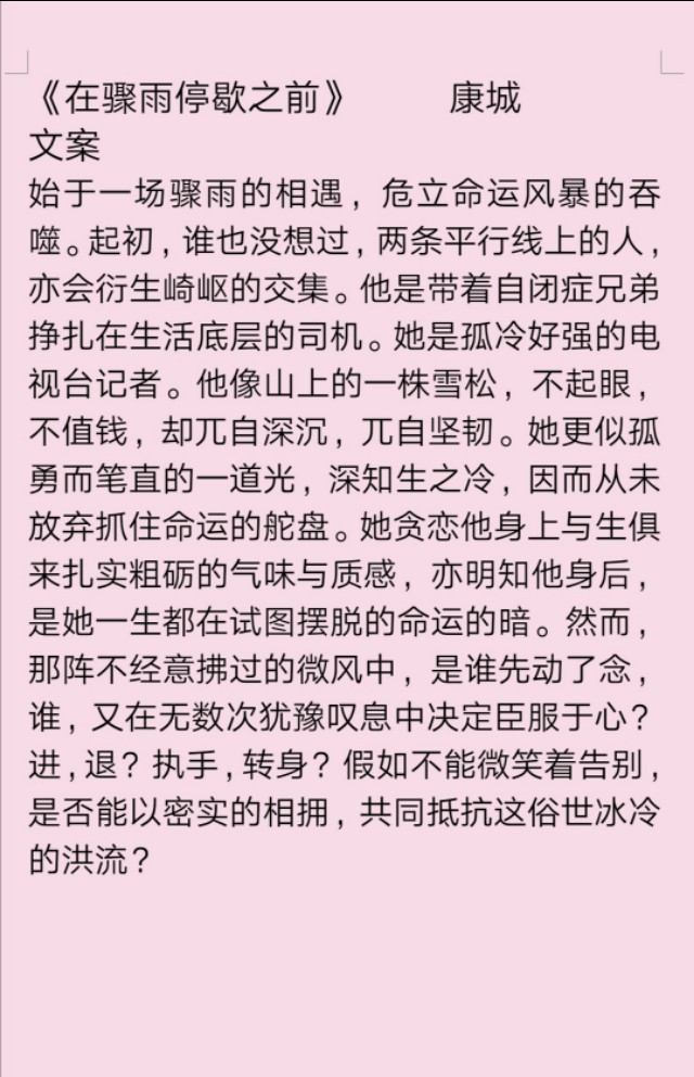这文网络原名为《阵雨》,女主是记者,男主是司机,还要照顾自闭症的兄弟。这文男女主就像生活中的我们,努力生活着,平凡而又坚韧,没有放弃,没有迷失。两人就在这平凡的生活碰撞而发生的爱情故事,也是朴素而又炽烈的!