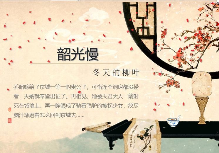 《韶光慢》邵明渊战争胜利收复燕城,获封冠军侯,凯旋归京。而他的妻子乔氏却因被当做人质被他射杀于战场前,仅留一腔热血在燕城城墙之上。乔昭就是这个新婚没洞房,后来在战场被夫婿射死的倒霉乔氏。再一睁眼,她变成了人贩子手里十三岁的少女黎昭,正前往她原来的家乡,脱身后她陆续遇到了黎家的人,过往的故人,还有用千年寒冰运送“她尸体”的“前夫”……