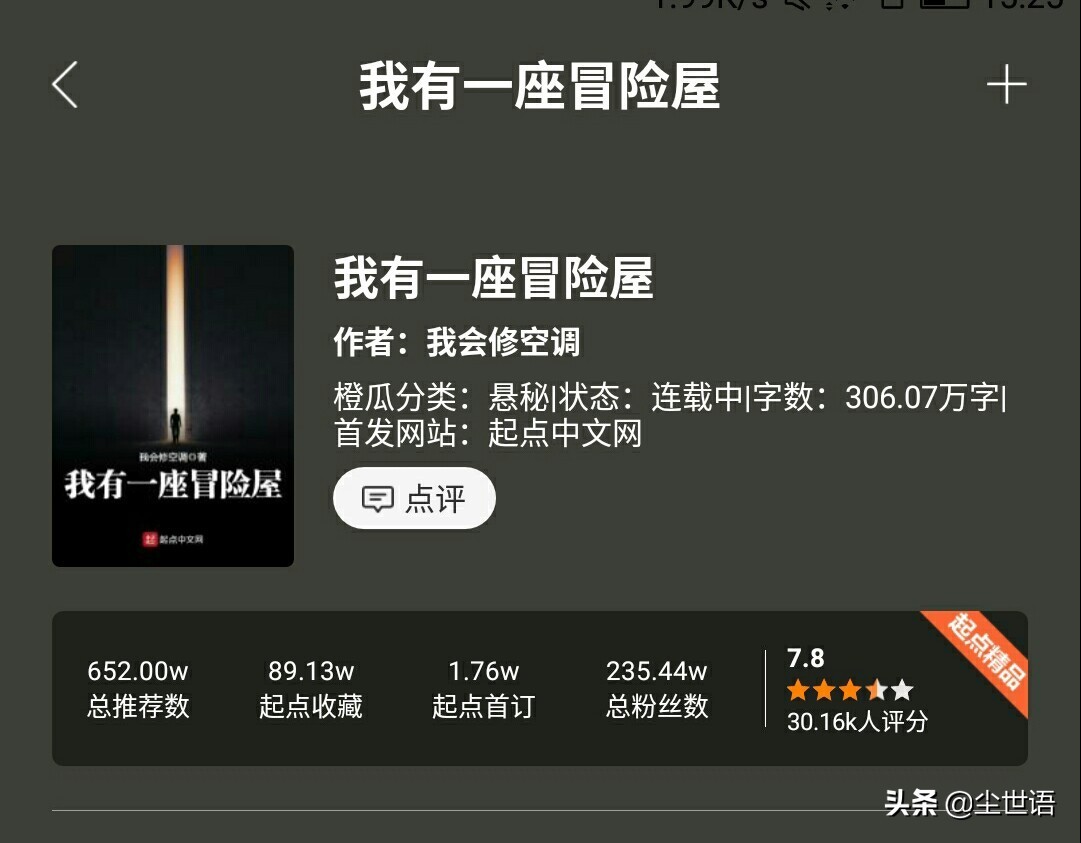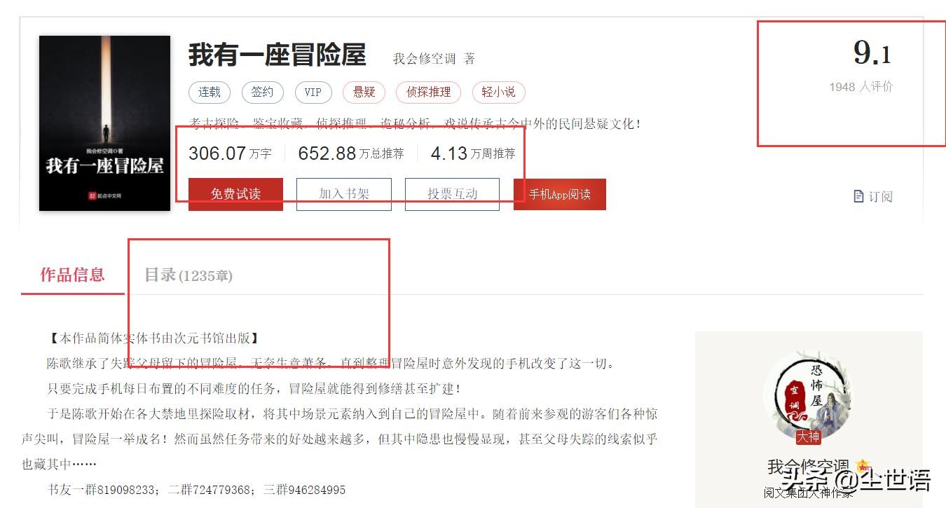 好消息好消息,从2018年6月连载,由作者我会修空调所著的起点爆款,灵异悬疑类网文小说《我有一座冒险屋》(PS:我还是喜欢《我有一座恐怖屋》这个书名)昨天宣告完结。